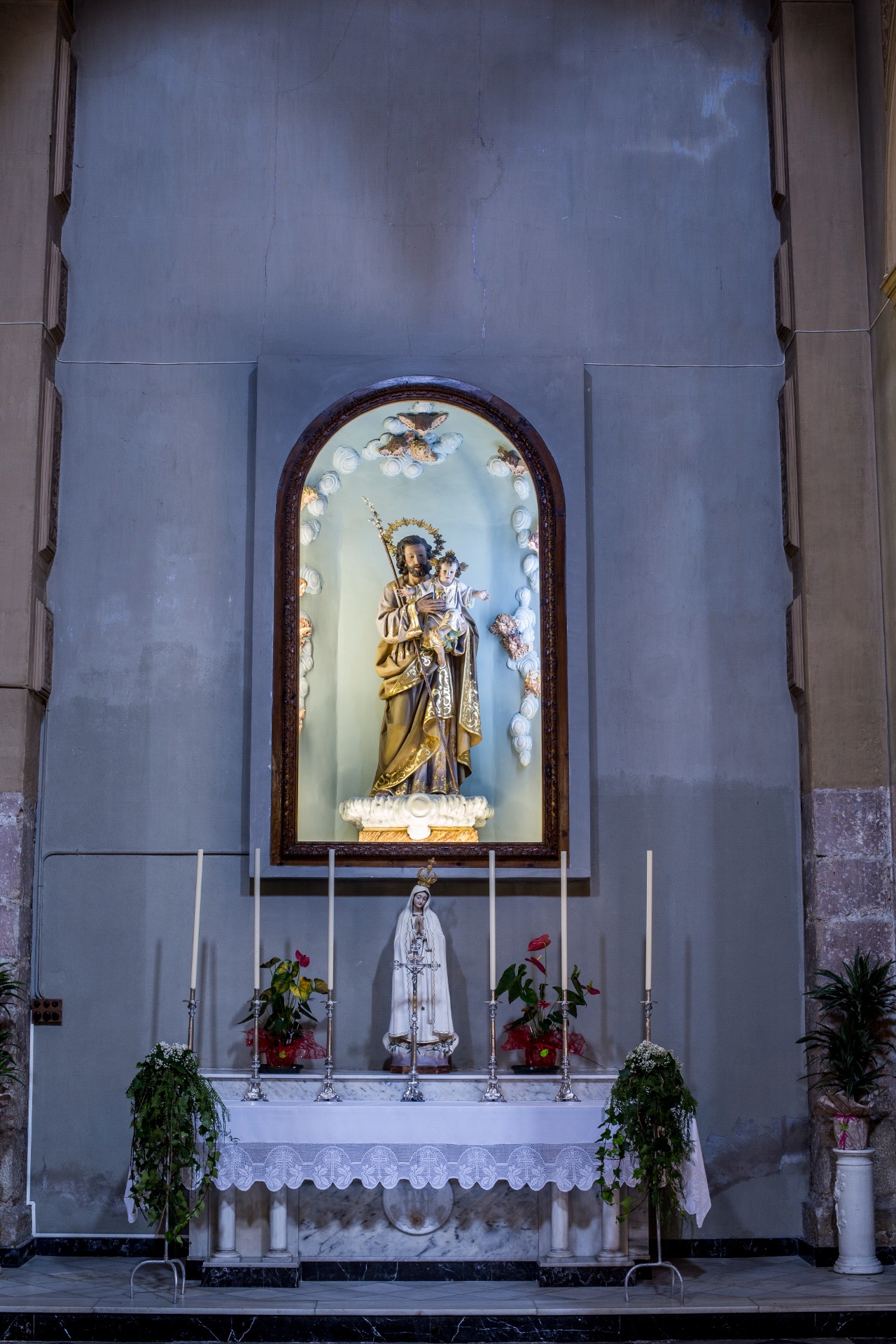 los pies de San José se encuentra también una imagen de la Virgen de Fátima, una de las advocaciones marianas más difundidas y queridas del siglo XX. Esta presencia recuerda la profunda devoción que muchos fieles profesan a la Virgen bajo este título y completa el ambiente de oración de la capilla.